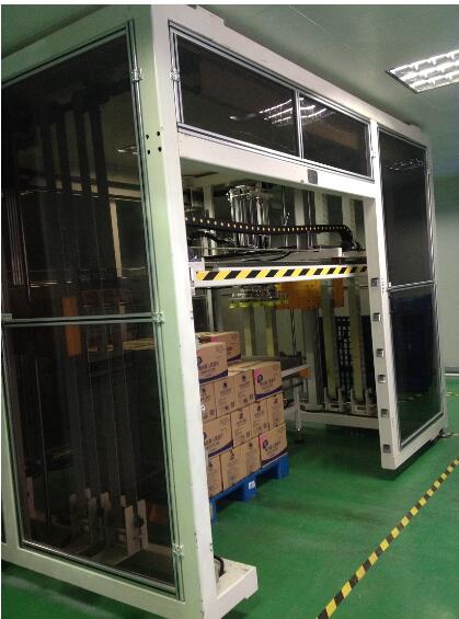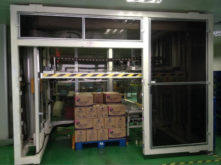 將產(chǎn)品通過進(jìn)料輸送帶輸送進(jìn)料,升降機(jī)移載著機(jī)械手夾具到產(chǎn)品上方,升降機(jī)構(gòu)下降抓取產(chǎn)品后平穩(wěn)上升,水平移動到棧板位,按事先輸入的碼垛形式進(jìn)行產(chǎn)品碼放。碼垛裝置是依靠伺服電機(jī)和鏈條傳動來同步運行控制,確保產(chǎn)品碼放位置淮確。