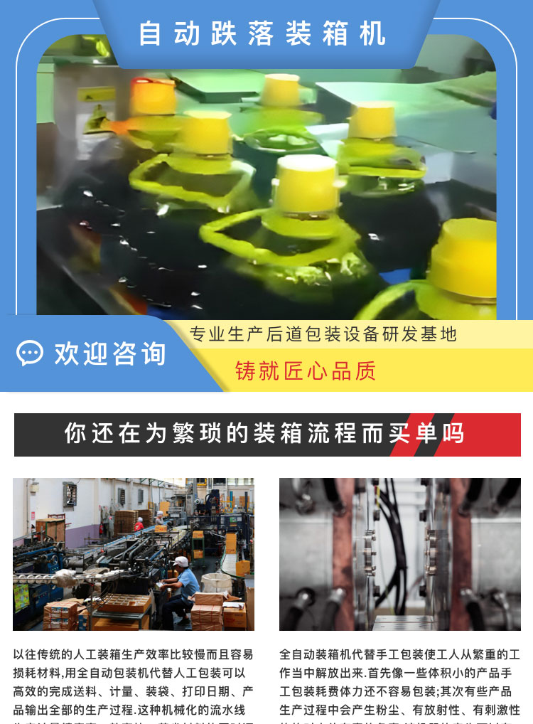 介紹:自動(dòng)跌落裝箱機(jī)。專(zhuān)業(yè)生產(chǎn)后道包裝設(shè)備研發(fā)基地鑄就匠心品質(zhì)。你還在為繁瑣的裝箱流程而買(mǎi)單嗎?以往傳統(tǒng)的人工裝箱生產(chǎn)效率比較慢而且容易損耗材料,用全自動(dòng)包裝機(jī)代替人工包裝可以的完成送料、計(jì)量、裝袋、打印日期、產(chǎn)品輸出全部的生產(chǎn)過(guò)程。這種機(jī)械化的流水線生產(chǎn)計(jì)量精度高、效率快、節(jié)省材料的同時(shí)還減少了人工成本。 全自動(dòng)裝箱機(jī)代替手工包裝使工人從繁重的工作當(dāng)中解放出來(lái)。像一些體積小的產(chǎn)品手工包裝耗費(fèi)體力還不容易包裝;其次有些產(chǎn)品生產(chǎn)過(guò)程中會(huì)產(chǎn)生粉塵、有放射性、有刺激性的的對(duì)人體有毒的危害。該機(jī)器的產(chǎn)生可以的解決這些問(wèn)題。 產(chǎn)品別稱(chēng):裝箱機(jī)、裝盒機(jī)、自動(dòng)裝箱機(jī)、自動(dòng)裝盒機(jī)、跌落式裝箱機(jī)、側(cè)推式裝箱機(jī)、抓舉式裝箱機(jī)、機(jī)器人裝箱機(jī)、一片式裹包機(jī)、食用油跌落式裝箱機(jī)。