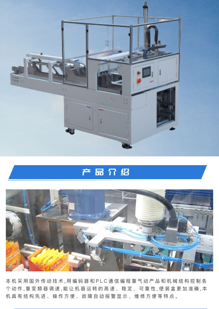 介紹:本機(jī)采用國外傳動(dòng)技術(shù),用編碼器和PLC通信編程靠氣動(dòng)產(chǎn)品和機(jī)械結(jié)構(gòu)控制各 個(gè)動(dòng)作,靠變頻器調(diào)速,能讓機(jī)器運(yùn)轉(zhuǎn)的高速、穩(wěn)定、可靠。本設(shè)備可實(shí)現(xiàn)自動(dòng)下料,開盒,關(guān)盒,黏膠等。 解決您的三大包裝難題實(shí)現(xiàn)自動(dòng)化生產(chǎn):1、大大降低企業(yè)的生產(chǎn)成本,單臺裝盒機(jī)八小時(shí)生產(chǎn)力約為3-5萬盒,按此計(jì)算每臺裝盒機(jī)可省人工為10-15人;2、人工裝盒,易污染、易出差錯(cuò).車間多一人,更是多一個(gè)污染源.人工裝盒有時(shí)會漏裝說明書或內(nèi)容物;3、提高企業(yè)生產(chǎn)力,從企業(yè)管理角度上來講,管理人難,管理設(shè)備易。 產(chǎn)品別稱:裝箱機(jī)、裝盒機(jī)、自動(dòng)裝箱機(jī)、自動(dòng)裝盒機(jī)、跌落式裝箱機(jī)、側(cè)推式裝箱機(jī)、抓舉式裝箱機(jī)、機(jī)器人裝箱機(jī)、一片式裹包機(jī)、條形全自動(dòng)裝盒機(jī)。