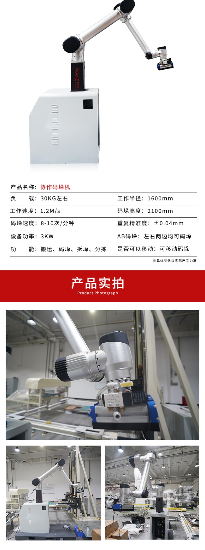 介紹:協(xié)作碼垛機(jī)器人是智能機(jī)器人,與人類工作人員緊密合作,提高生產(chǎn)效率、靈活適應(yīng)不同任務(wù)。配備傳感器,能自主學(xué)習(xí)、感知環(huán)境。廣泛應(yīng)用于紙箱、醫(yī)藥、食品等多個行業(yè)生產(chǎn)線。革命性提高生產(chǎn)線智能化程度,為工作人員創(chuàng)造更的工作環(huán)境。